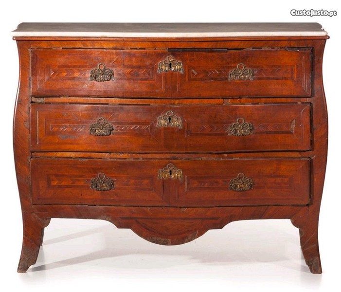 Cómoda Luís XV do final do séc. XVIII com embutidos em várias madeiras exóticas e tampo em mármore.