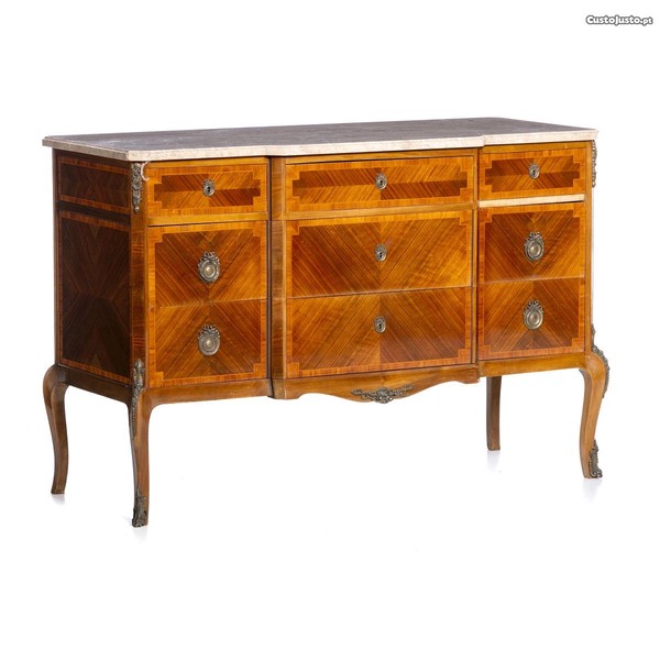 Cómoda Estilo Luís XV, portuguesa, do século XX capeada as várias madeiras, com tampo em mármore, ferragens e aplicações em metal.