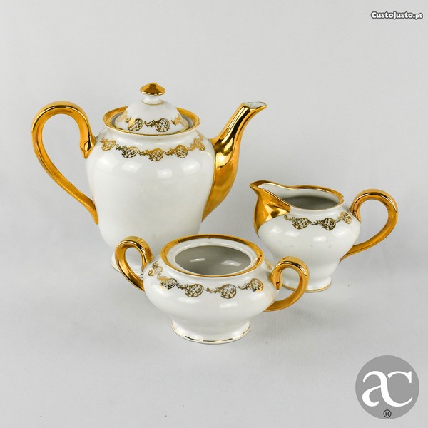 Preço: 75 €Conjunto de Bule, açucareiro e leiteira porcelana Artibus, decoração a ouro