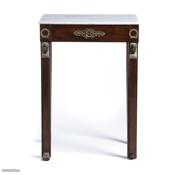 Consola estilo império portuguesa, em madeira de mogno com aplicações em bronze. Tampo em mármore.
