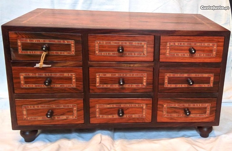 Caixa Contador em madeira de pau santo, vinhático e outras com aplicações em marfim com 9 gavetas.