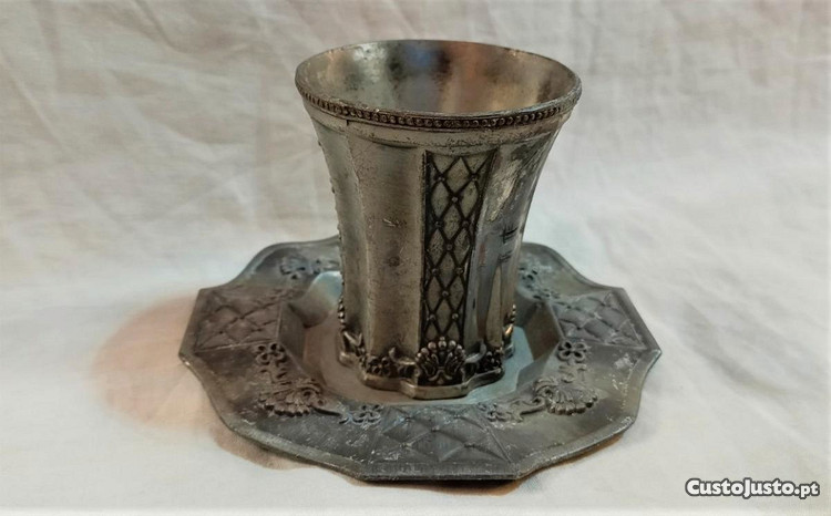 Copo e pires de ritual judaico Kiddush em metal feito à mão por artista judeu nos anos 40.