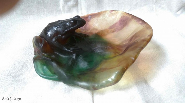Belíssima peça em pasta de vidro de um sapo a repousar numa folha da prestigiada Daum France.