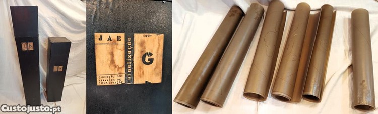 6 esboços em papel vegetal dos sinais verticais de sinalização da J.A.E. (Junta Autónoma de Estradas) e 2 estojos em madeira com 4 divisórias cada um.