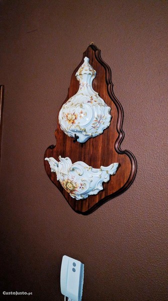 Bela fonte decorativa em porcelana com suporte em madeira.