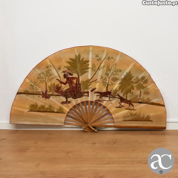 Este belo leque de seda japonês, datado do período Meiji (1868-1912), apresenta uma pintura detalhada e colorida de uma figura correndo pela paisagem, cercada por vida selvagem e natureza exuberante. É um elegante exemplo da arte tradicional japonesa, onde o uso de seda e bambu cria um visual refinado. O leque não é apenas um objeto funcional, mas também uma obra de arte que reflete a estética refinada do período Meiji, uma época de grandes transformações culturais e industriais no Japão. O seu design delicado e cores vibrantes tornam-no um objeto marcante e valioso para colecionadores de antiguidades e arte japonesas.