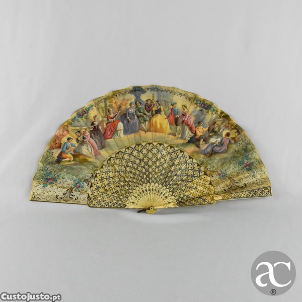 Preço: 250 €Leque europeu em osso? e papel, 2 faces, pintado à mão, séc. XIX