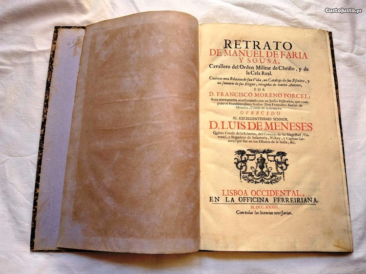 Livro raro do ano de 1733, " Retrato de Manuel de Faria y Sousa " de D.