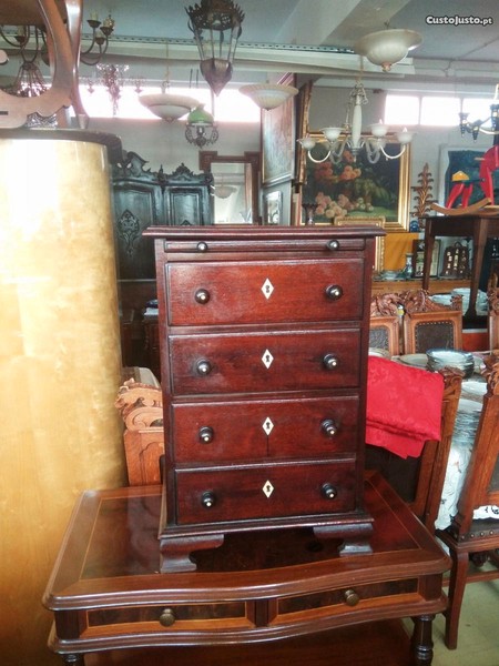 Mesinha cabeceira com tampo e 4 gavetas em madeira de nogueira com embutidos em marfim.