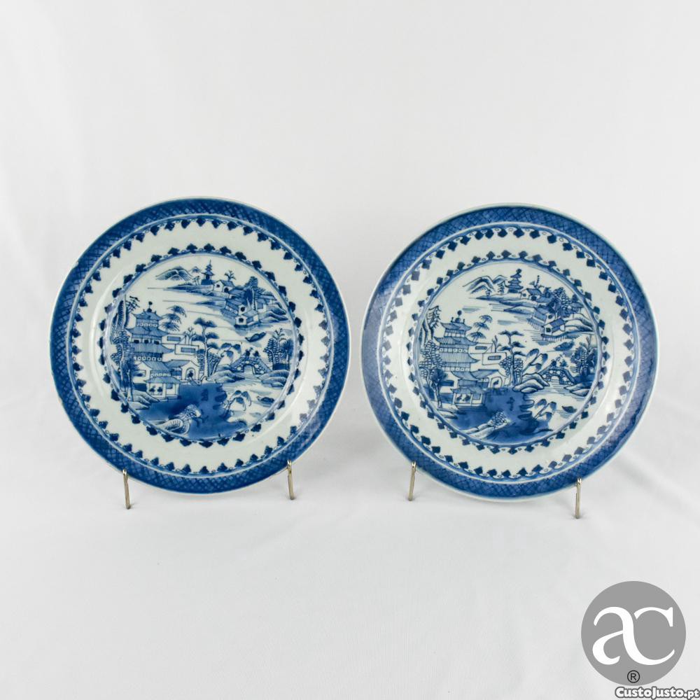 Preço: 290 €Par de pratos em porcelana da China período Qianlong, séc. XVIII, pagodes e paisagem
