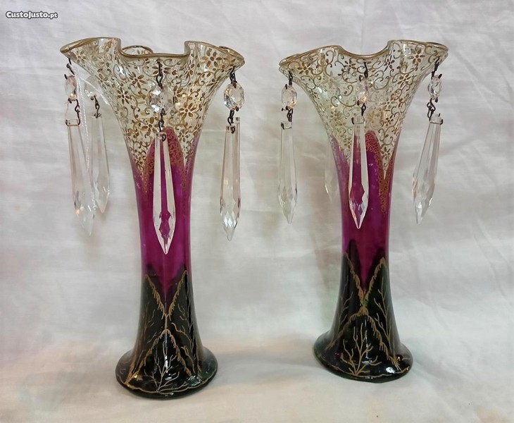 Par de belas jarras em vidro pintado à mão, europeias, início do Séc XX.