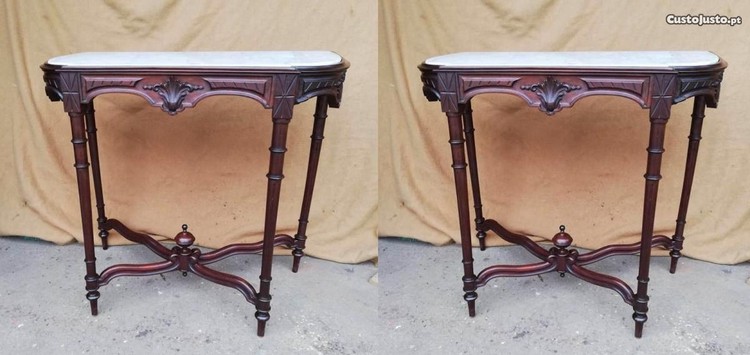 Par de mesas de encostar ( consolas, credências ) em madeira de nogueira e outras com tampo em mármore devidamente restauradas por técnico da especialidade.