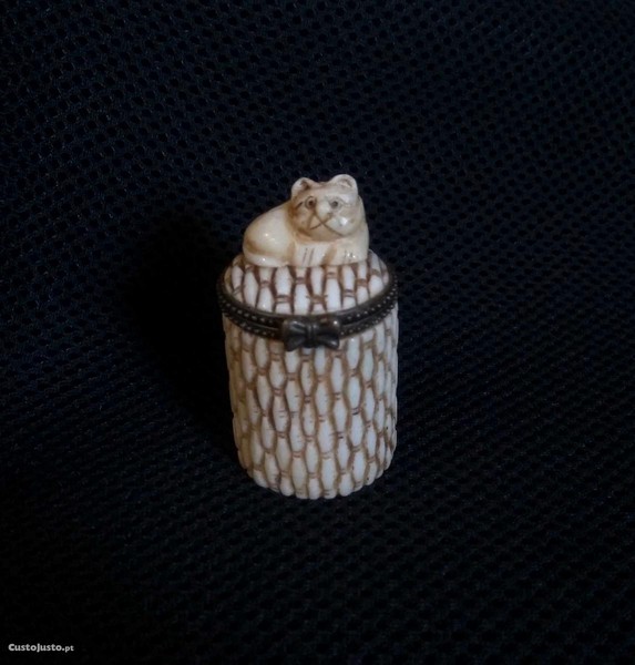 Pequena caixa em osso e latão com gato no topo da tampa.