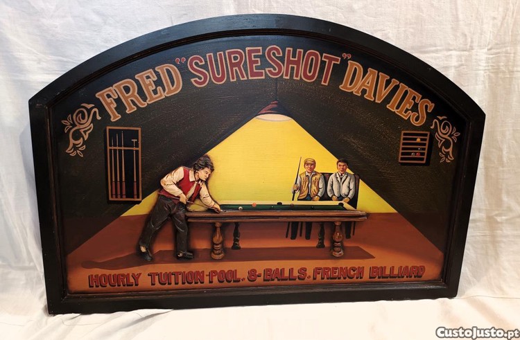 Placa publicitária em madeira de bilhares, Fred Sureshot Davies.