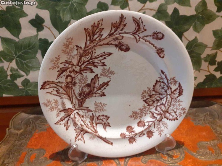 -Descrição: prato em faiança da Fábrica de Alcântara Lisboa, decorado com motivos vegetalistas de cor castanho sépia. Peça gravada com a letra L.