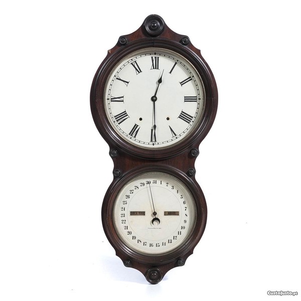 Relógio de parede americano, caixa em madeira de pau-santo em forma de um oito, com calendário "Seth Thomas Clock".
