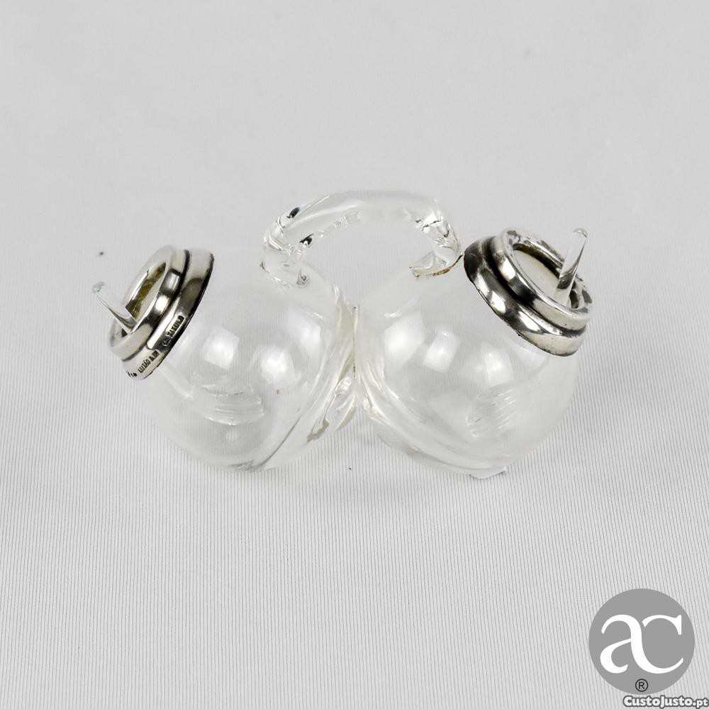 Saleiro e Pimenteiro em vidro e prata Leitão & Irmão, com pequenas colheres