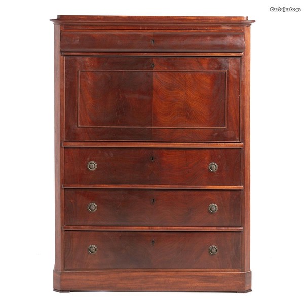 Secretária portuguesa do século XIX, em madeira de mogno. Parte superior com uma gaveta e tampo e fábrica com nove gavetas,um gavetão e portinhola central.
