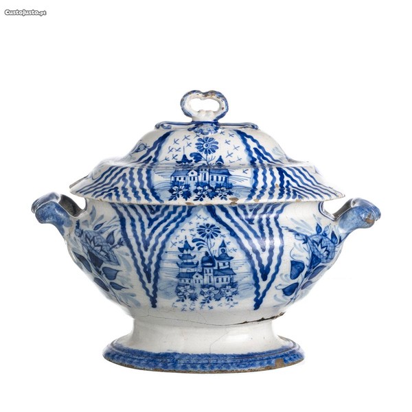 Terrina com tampa em faiança Portuguesa do século XIX. Corpo partido e colado, falhas no vidrado.
