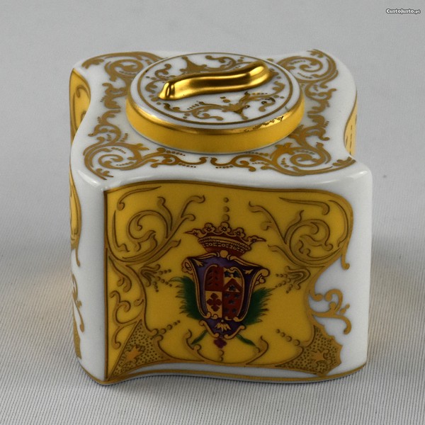 Tinteiro em porcelana com brasão, ricamente decorado com dourados