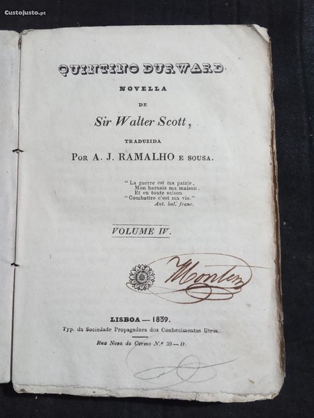 exemplar com mais de 180 anos quarto volume desta novella traduzida por A. J. Ramalho e Sousa 1839 capa danificada interior razoável completo preço com portes incluídos em correio editorial