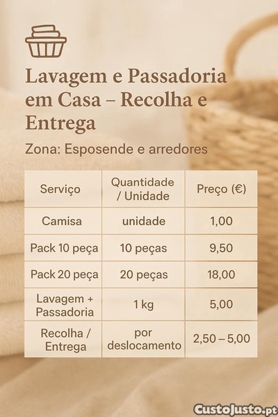 Lavagem e Passadoria roupas em Casa. Recolha e Entrega. Profissionalismo, rapidez garantindo.
