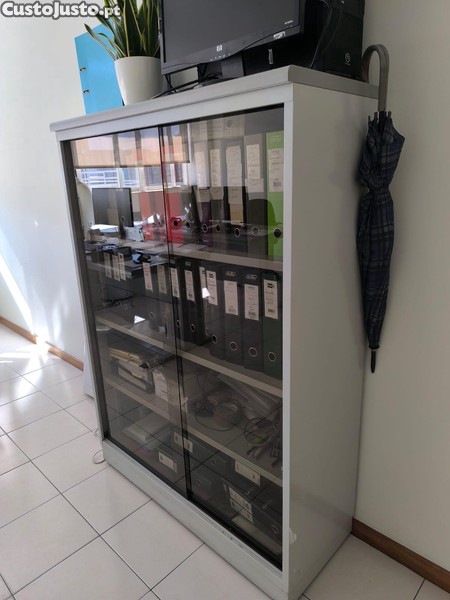 Conjunto de 2 secretárias de 1.50m + 2 blocos de gavetas+ 2 cadeiras + 1 estante 1,50X1.80 com portas em vidro + mesa com tampo em vidro e 4 cadeiras