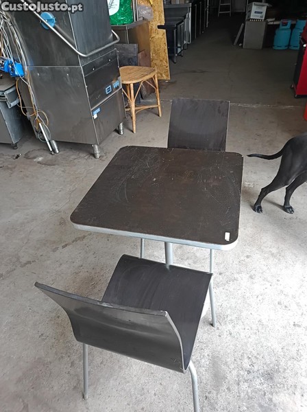 Mesas quadradas com cadeiras com algumas marcas de uso