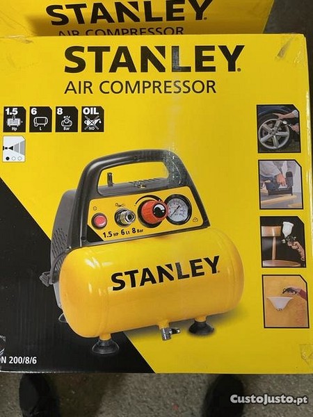 Preço: 115 €Compressor Stanley de 6 Litros, com 1.5 Hp , tem 8 bares!
