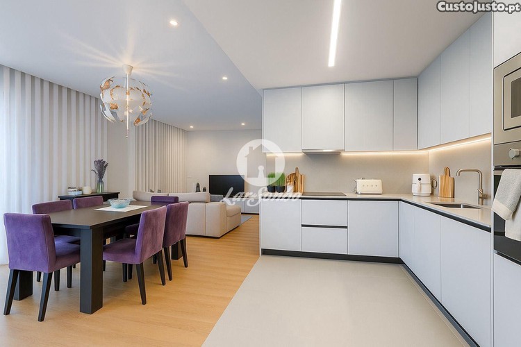 A cozinha encontra-se equipada com todos os eletrodomésticos necessários para o dia a dia: placa, forno, exaustor, micro-ondas, frigorífico e máquina de lavar loiça, integrados de forma elegante e funcional.
