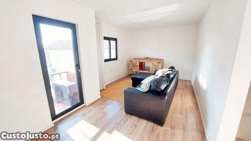 A cozinha tem formato open space, sala ampla, 2 quartos, 1 wc completo com duche, 1 varanda.
