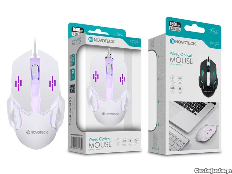 Preço: 13 €Rato Óptico Iluminado Branco JS-006 com Fio 1600 DPI Ajustável, Design Ergonómico, Plug-and-Play