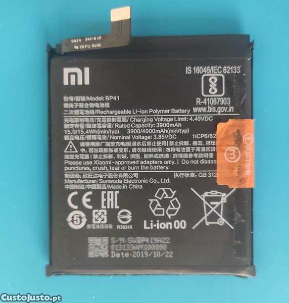 Vendo bateria original do Xiaomi Mi 9T, retirada do meu telemóvel após substituição. A bateria está em bom estado, com capacidade ainda razoável, ideal para quem precisa de uma peça original para reparação ou substituição. Foi usada com cuidado e retirada por um profissional durante o conserto do meu telemóvel. Através de aplicações de "benchmark" do desempenho e estado da bateria, estima-se que tenha pelo menos 75% da capacidade de carga original.