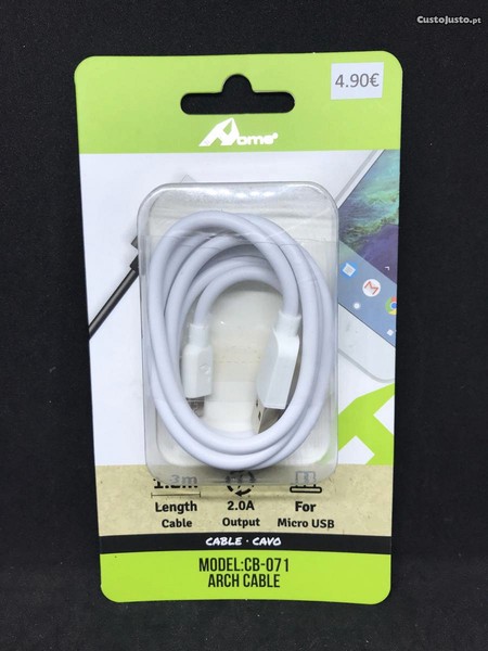 Cabo carregador Micro USB - 1,2 metros - 2.0Amp - Novo / Selado (4,90 Euros)