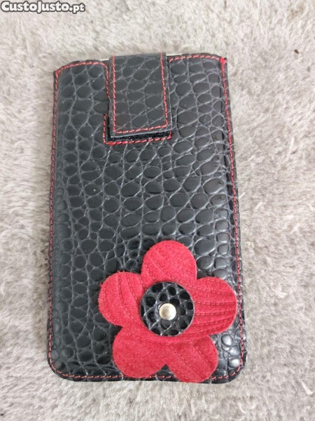 Capa para telemóvel em pele preta com textura crocodilo, feita à mão. Tem um detalhe floral vermelho e fecho com velcro. É elegante e prática. - Material: Pele - Cor: Preto com detalhe vermelho - Fecho: Velcro - Artesanal