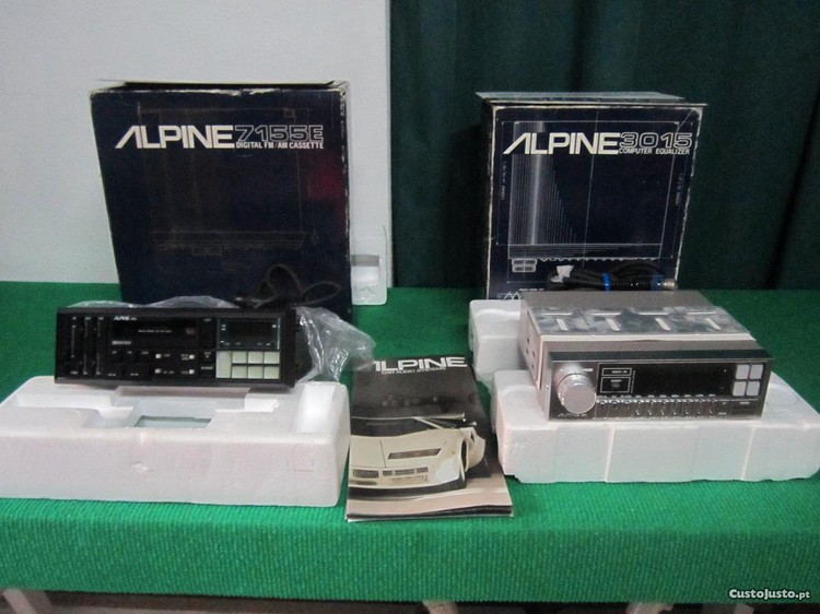 Conjunto de auto rádio ALPINE 7155E, equalizador ALPINE 3015, amplificador ALPINE com respectiva cablagem completa, rigorosamente NOVOS EM CAIXA.