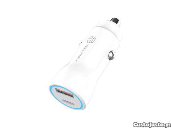 Preço: 6 €Carregador de Carro 18W Branco Dupla Saída PD+QC Compatível com Carros e Caminhões Carregamento Rapido