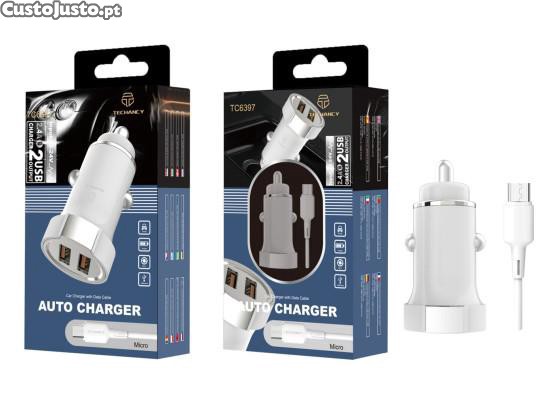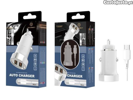 Carregador De Carro Com Cabo Micro Usb 2.4A 1M 2Usb Branco/Prata