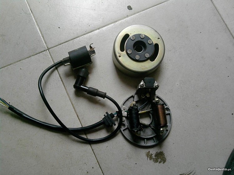 parte eletrica pitbike em excelente estado, inclui prato de bobines com luz e pick.up, volante magnetico e bobine de vela, tudo em optimo estado e a funcionar a 100% preço 50euros FIXOS.