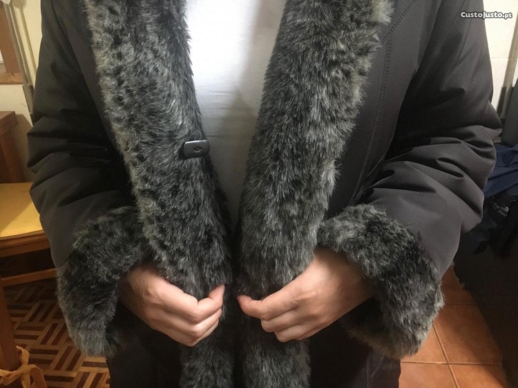 Casaco de mulher, de dupla face: de um lado casaco impermeável, do outro casaco de pêlo.