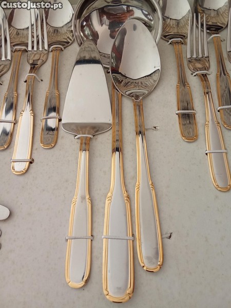 Vendo este faqueiro em aço inoxidável, novo e nunca usado. É folheado a dourado, serve para 12 pessoas com conjuntos para todas as refeições. Contém 144 peças. Acrescem os portes de envio.