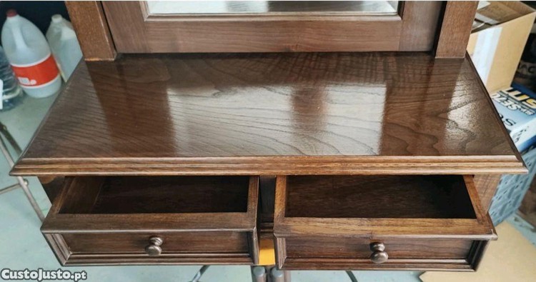 Psiché com 2 gavetas e espelho biselado, madeira maciça de castanho, peça feita em marcenaria local. Peça com 25 anos em excelente estado de conservação, pouco uso.