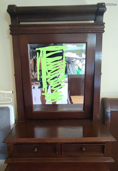 Psiché em madeira de castanho velho e espelho com bisel largo, 2 gavetas.
