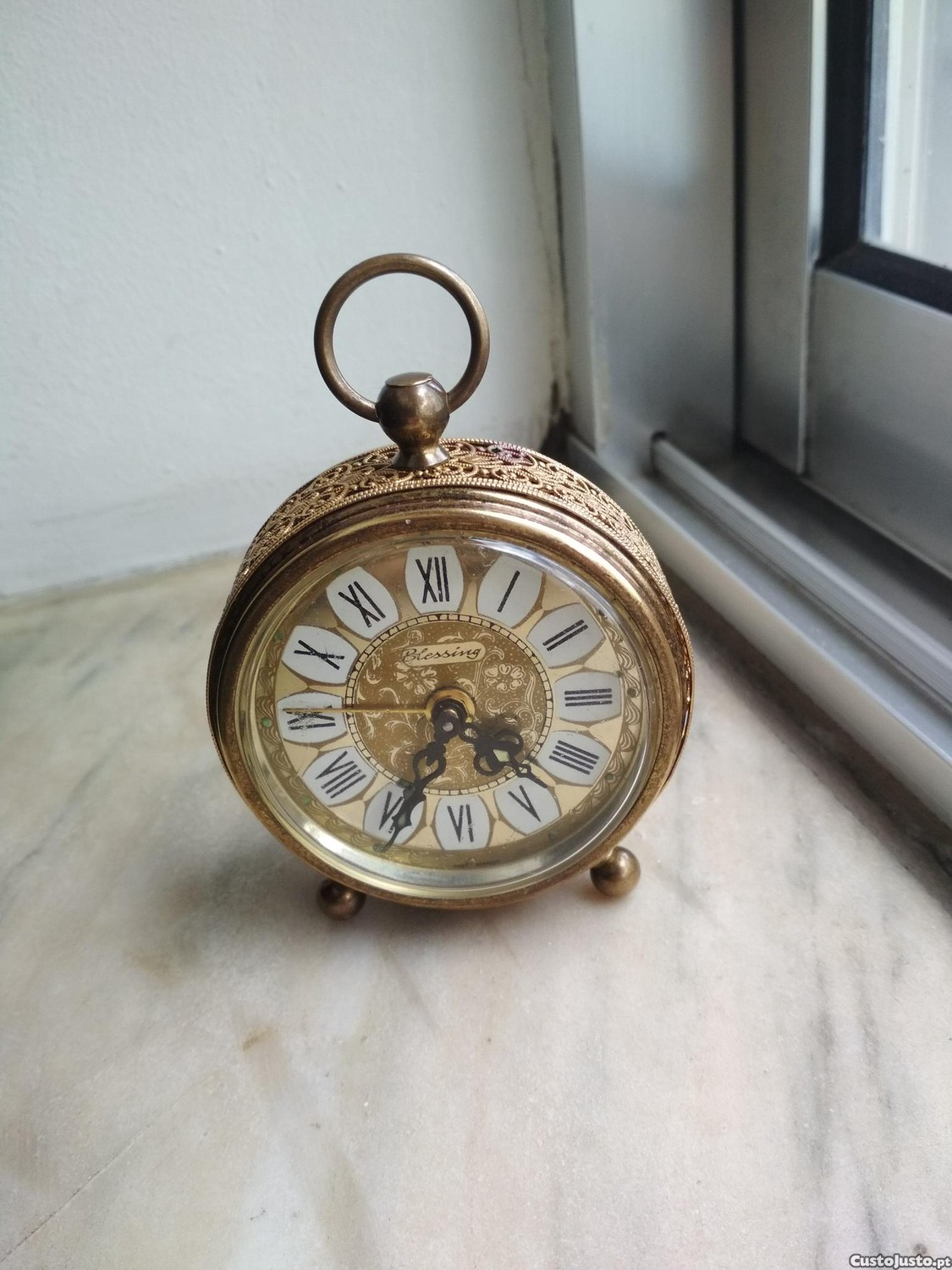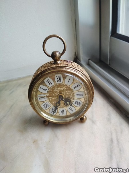 Relógio despertador vintage, anos 60, fabricado na antiga Alemanha Ocidental, com caixa metálica dourada, estilo de filigrana portuguesa. Mostrador dourado, com marca ás 12 horas, ponteiros com refletor noturno e números romanos pretos em fundo branco. Encontra-se em muito bom estado de conservação e a funcionar completamente. Estes relógios continuam a ser muito procurados em toda a Europa. Ótima peça de coleção