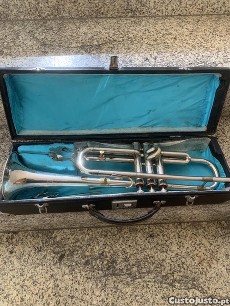Trompete com estojo em pele da marca symphonic e tem 3 bocais.