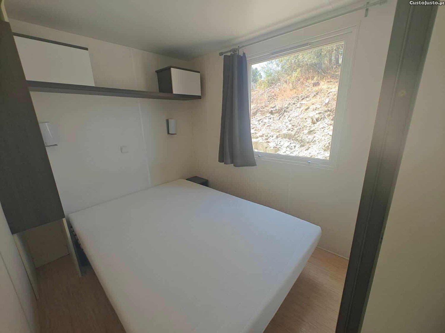 O mobil-home é composto por uma casa de banho, uma sanita, uma cozinha em open space com a sala e dois quartos.