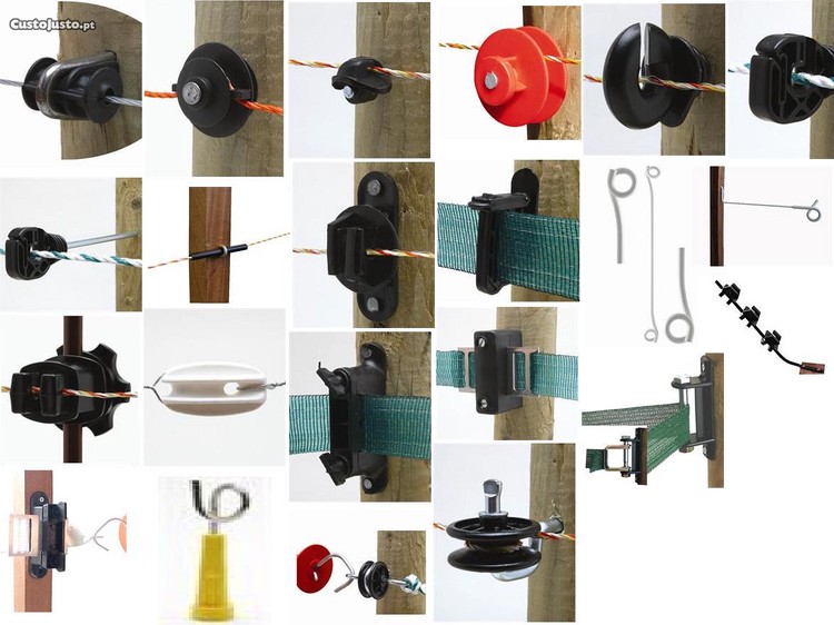 Há diversos isoladores para cercas elétricas no mercado como se pode ver na imagem: