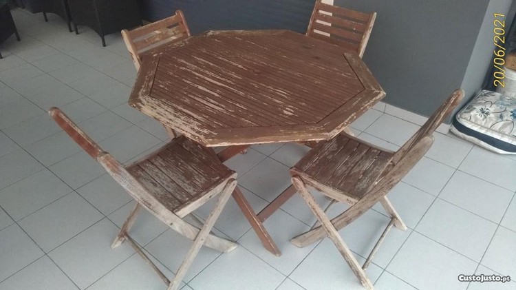 Vendo conjunto em madeira com mesa com cerca de 115cm de diâmetro e 4 cadeiras em madeira para jardim ou terraço, usado em bom estado