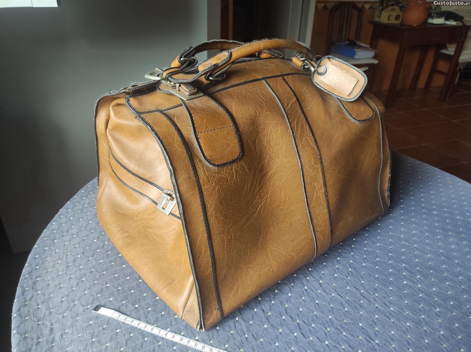 Mala de viagem vintage, em couro de cor clara em bom estado geral.
