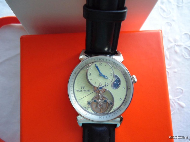 Relógio automático FOLLI FOLLIE original; novo; diâmetro da caixa 42 cm; bracelete preta em couro larg 20mm; resistente à água; inclui estojo da marca; pré-pagamento por transferência bancária; entrega grátis se for na cidade, ou acresce portes de envio.